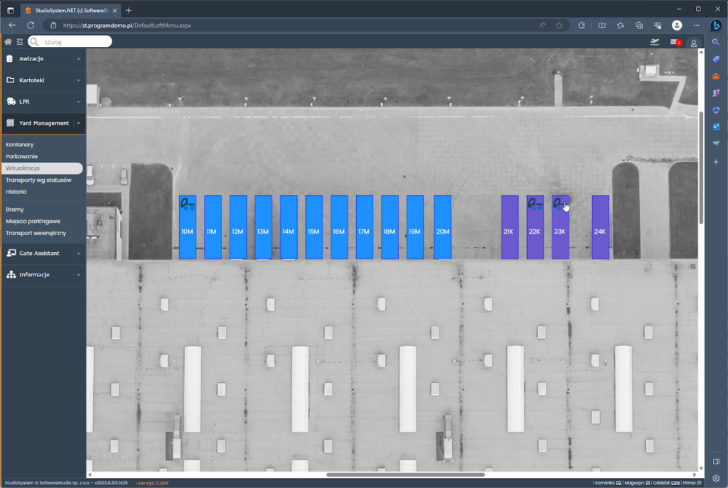 Aplikacja ta jest narzędziem do efektywnego zarządzania przestrzenią i ruchem pojazdów w obiektach logistycznych, umożliwiając operatorom wizualną kontrolę i zarządzanie placem manewrowym w czasie rzeczywistym.