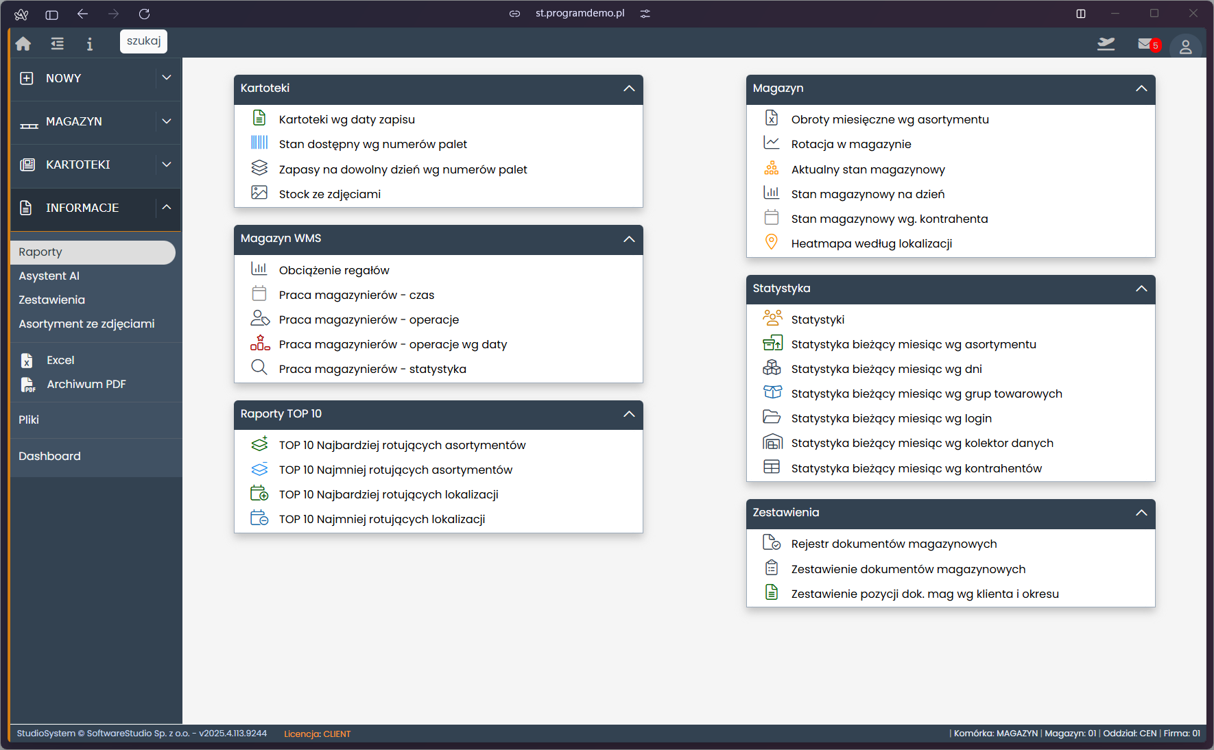 Ekran główny systemu Studio WMS.net prezentuje opcje raportowania i zestawień