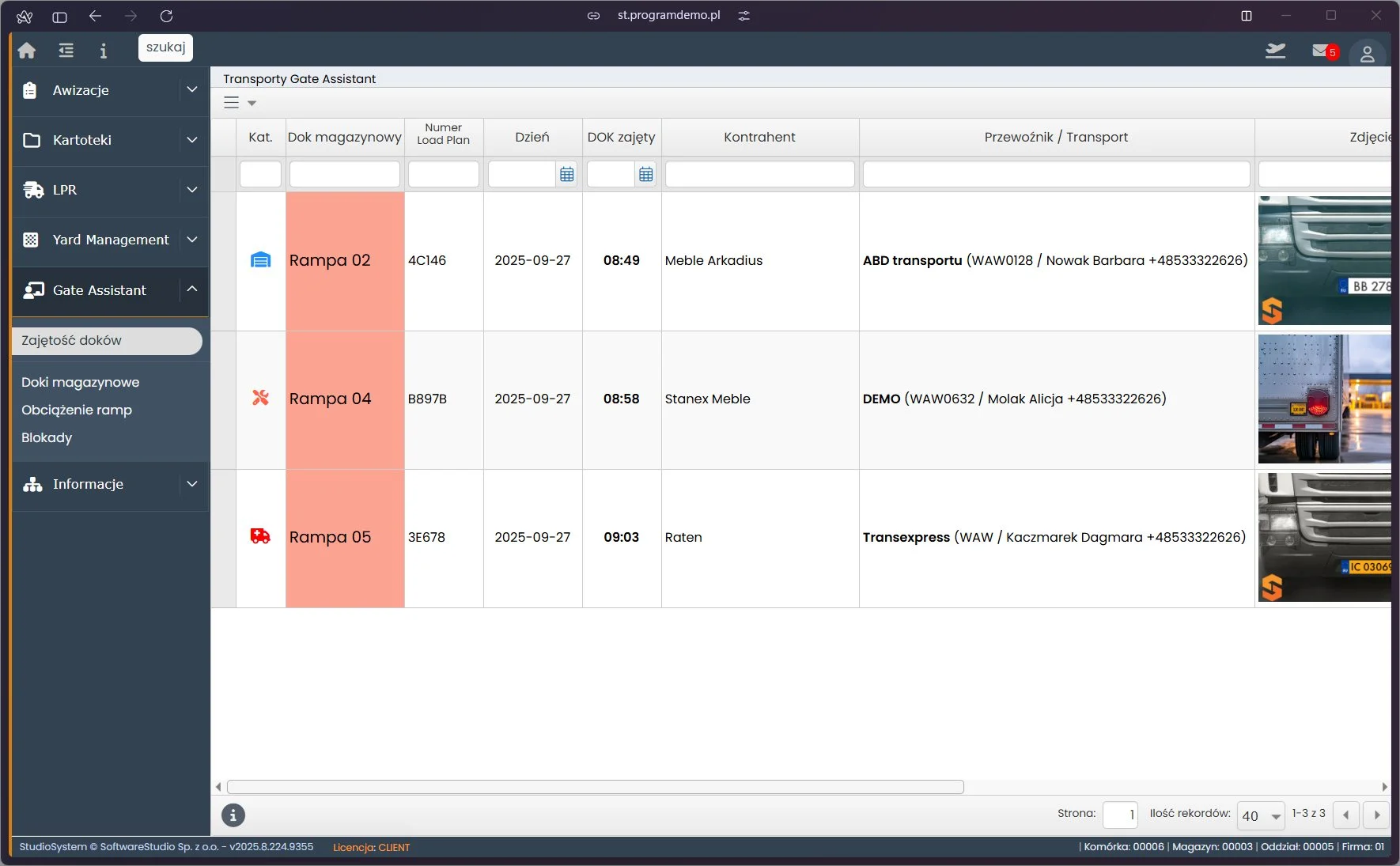 | Integracja z WMS | Synchronizacja zleceń z systemem Studio WMS.net; przekazywanie informacji o przydziale bramy bezpośrednio do kierowcy |