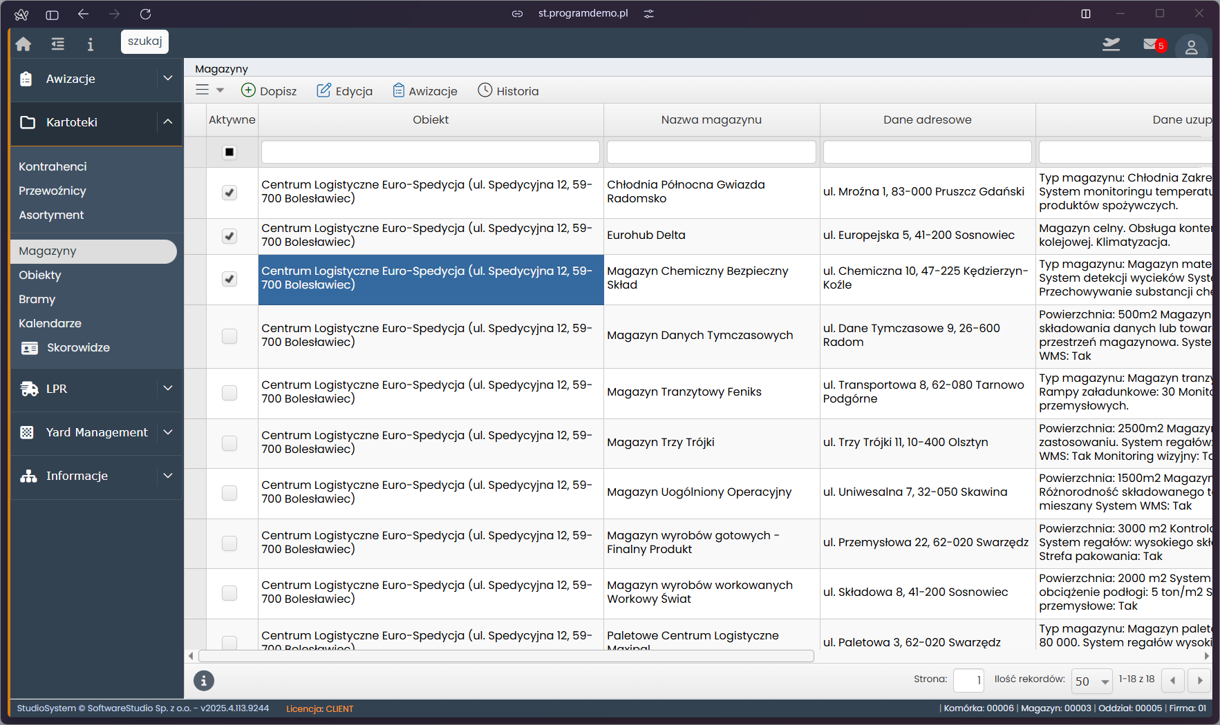 Ważne są Dane adresowe. To dokładny adres magazynu. Program Studio WMS.net pokazuje również Dane uzupełniające. Tutaj znajdziesz szczegółowy opis magazynu. Są tam informacje o typie magazynu, powierzchni, liczbie palet. To również dane o funkcjonalnościach, takich jak system detekcji wycieków czy integracja z systemem ERP.