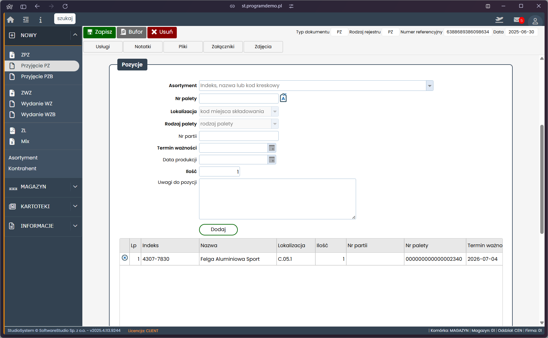 - Tabela pozycji: Poniżej formularza „Pozycje” znajduje się tabela. Wyświetla ona dodane pozycje. Zawiera kolumny: Lp (Liczba porządkowa), Indeks, Nazwa, Lokalizacja, Ilość, Nr partii, Nr palety, Termin ważności.