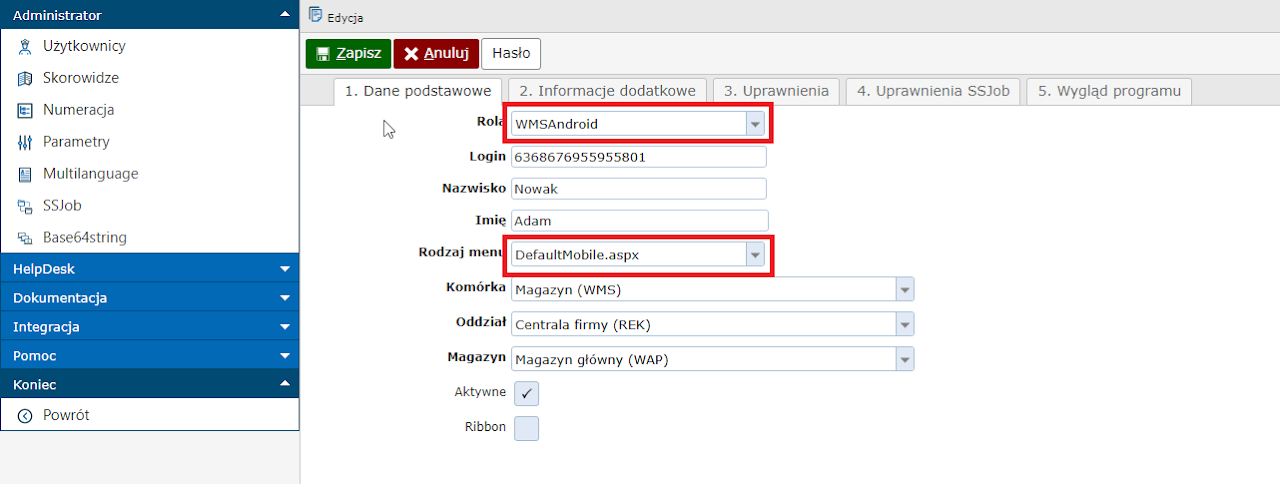 Zarządzanie uprawnieniami odbywa się centralnie, ale ma bezpośredni wpływ na funkcjonowanie aplikacji Android. Administrator przypisuje każdemu użytkownikowi rolę systemową, która definiuje, do jakich modułów i operacji ma on dostęp. Może to być np. tylko przyjęcie towaru, inwentaryzacja, wydania lub pełen dostęp operacyjny. Dzięki temu każdy pracownik wykonuje tylko te zadania, które są mu przypisane.