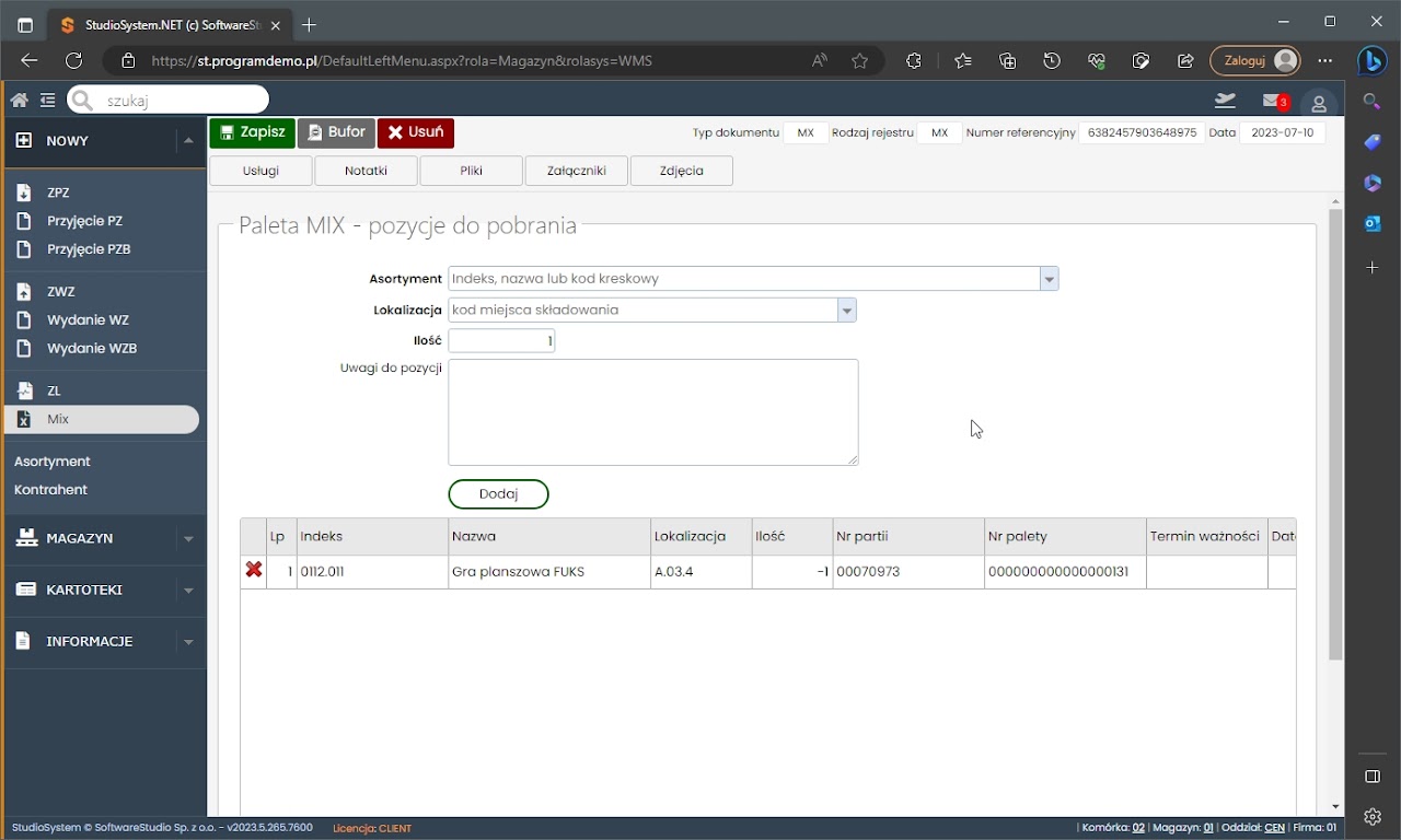 Po dodaniu wszystkich artykułów (pozycji) należy użyć Zapisz. Wtedy też wyświetlona zostanie nowa sekcja, gdzie należy wybrać lokalizację składowania, rodzaj palety oraz nadać jej numer. Dodatkowo można uzupełnić numer wewnętrzny, wybrać magazyniera wykonującego mix i dopisać uwagi do dokumentu.