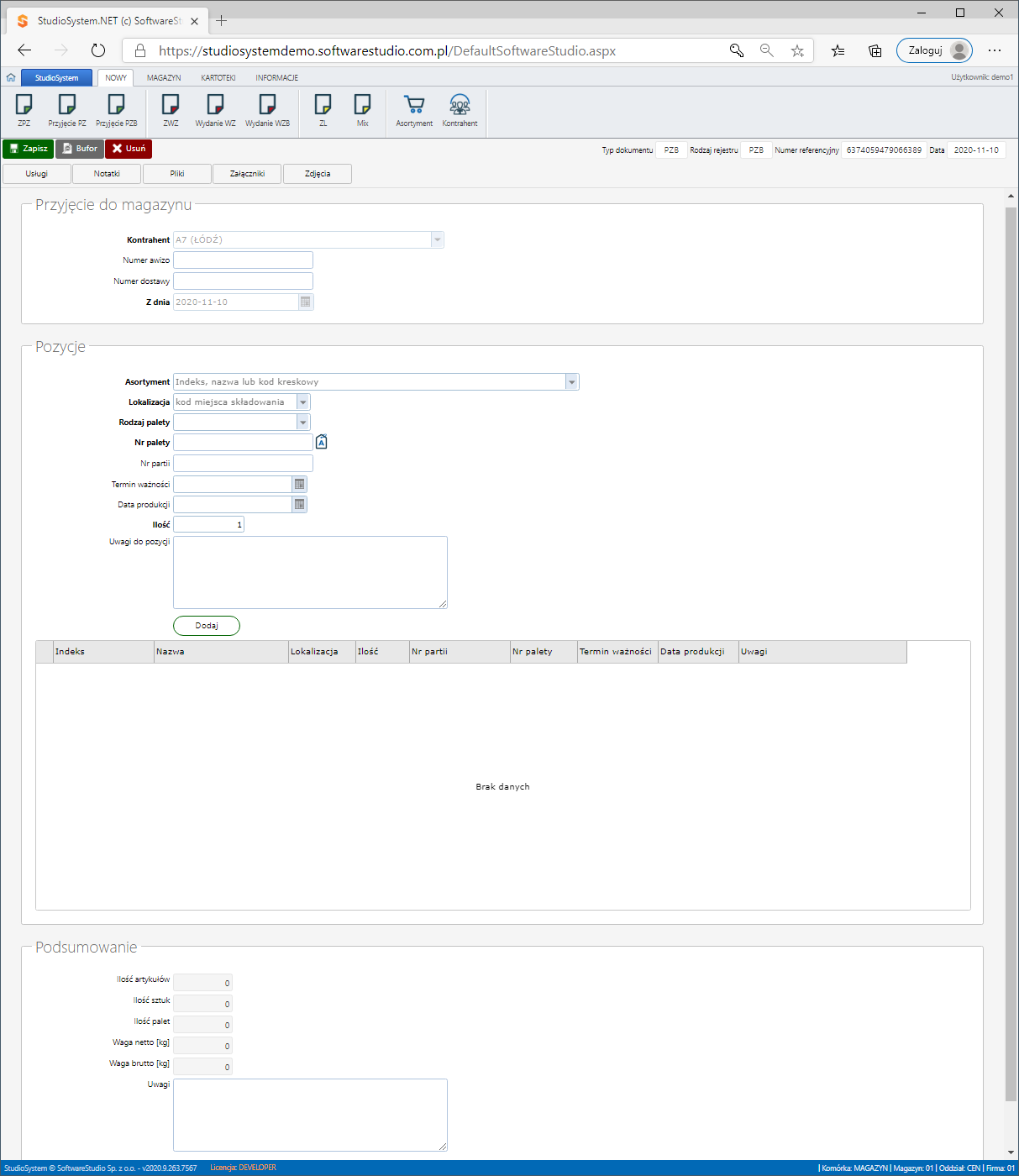 Formularz do tworzenia nowego dokumentu PZB w Studio WMS.net składa się z trzech głównych sekcji: nagłówka, pozycji i podsumowania. W nagłówku użytkownik obowiązkowo musi wybrać kontrahenta (dostawcę) oraz podać datę przyjęcia; można również wprowadzić numer awizo czy dostawy. Następnie, w sekcji pozycji, dodaje się poszczególne towary, wybierając je z listy asortymentu przypisanego do danego kontrahenta, określa się ich ilość, lokalizację składowania oraz informacje o palecie (rodzaj, numer). Na koniec, sekcja podsumowania automatycznie oblicza zbiorcze dane dotyczące przyjęcia, takie jak łączna liczba artykułów czy palet. Użytkownik może zapisać dokument tymczasowo (Bufor) lub ostatecznie (Zapisz), co determinuje, w którym rejestrze dokument się pojawi.
