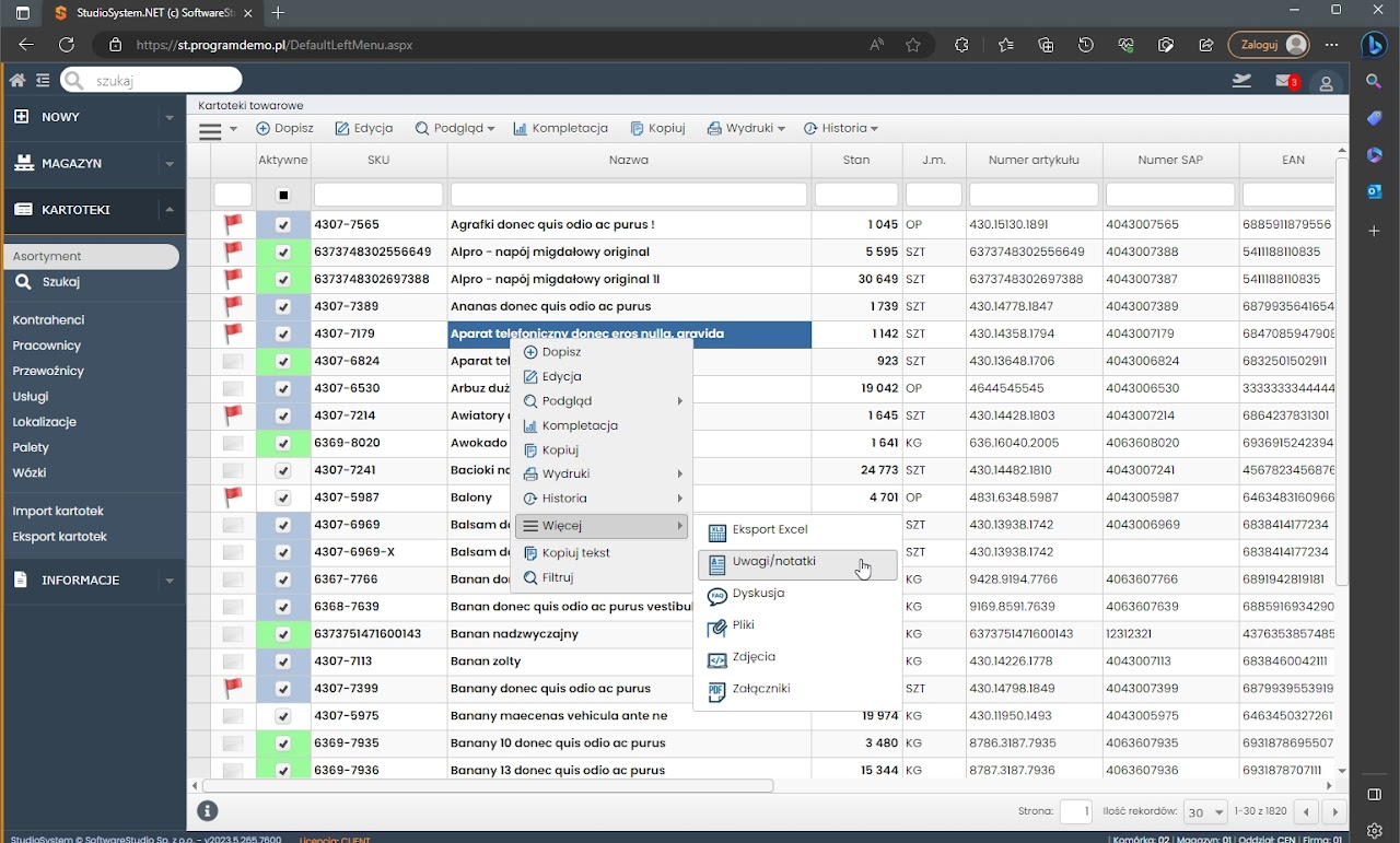 Studio WMS.net oferuje również ważne funkcje standardowe do zarządzania danymi. Umożliwia filtrowanie i sortowanie informacji w tabelach, co znacząco przyspiesza wyszukiwanie potrzebnych rekordów. Istotną opcją jest możliwość dodawania notatek, prowadzenia dyskusji oraz dołączania załączników (np. dokumentów PDF) i zdjęć bezpośrednio do kartotek czy dokumentów magazynowych. Dodatkowo, użytkownicy mogą łatwo eksportować dane do formatu Excel (XLS, XLSX) w celu dalszej analizy lub tworzenia raportów, korzystając z predefiniowanych zestawień lub własnych filtrów.
